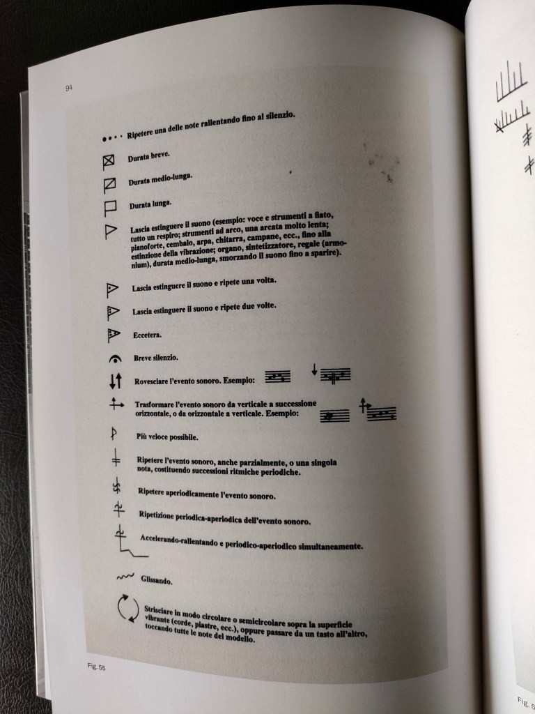 There is no historical trace of records or performances of this “operation”, only this catalog remains. The “Synthetic index of instruments, of all dimensions” is incredible: it is a summation of ancient music instruments, electronic music (“all instruments can be amplified and elaborated electronically”), everyday objects (boilers, pans, dishwashers, vacuum cleaners, washing machines, teleprinters, linotypes, typewriters…), soundscapes (birds, waterfalls), human sounds not made on traditional instruments (claps, buzz). I sincerely hope that one day this score will finally be performed.