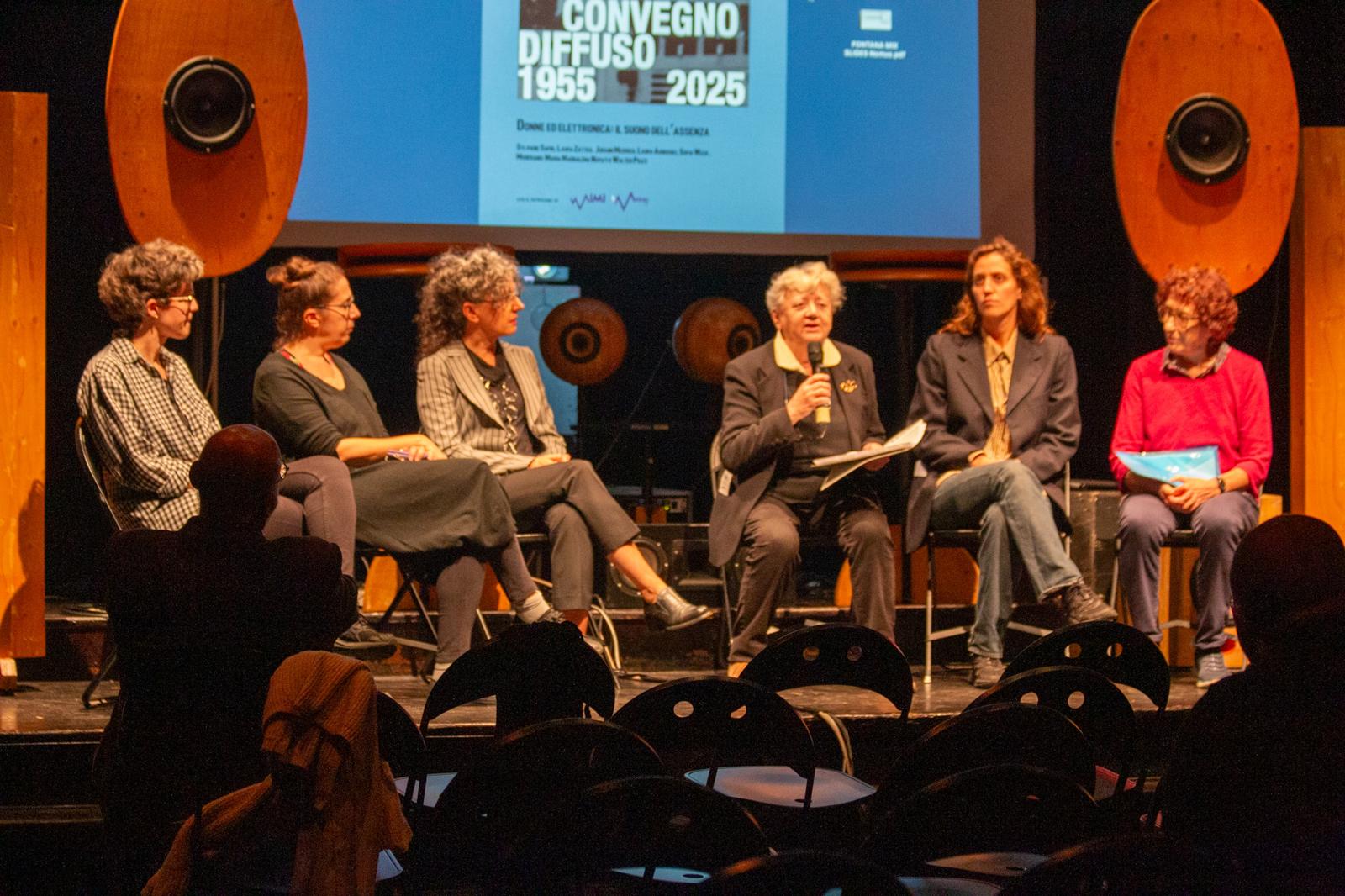 - Round Table “Donne ed elettronica: il suono dell’assenza” 🎛️ FONOLOGIA — Convegno diffuso 1955–2025 From left: Laura Agnusdei, Johann Merrich, Laura Zattra, Maria Maddalena Novati, Sofia Weck, Sylviane Sapir, 10 october 2025 ↩︎